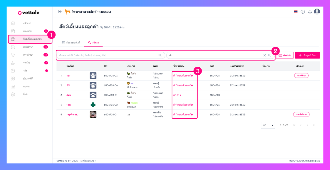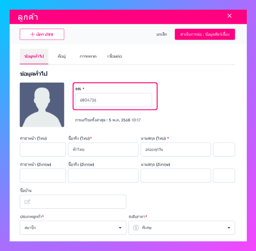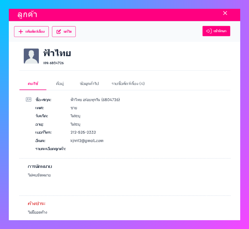 ผู้ใช้งานสามารถแก้ไขเลขรหัสเจ้าของได้โดย คลิกเมนูสัตว์เลี้ยงและลูกค้า ค้นหาชื่อเจ้าของ คลิกชื่อเจ้าของสัตว์เลี้ยง คลิกแก้ไข ผู้ใช้งานสามารถแก้ไขรหัสเจ้าของสัตว์เลี้ยงได้ จากนั้นกด ดำเนินการต่อ:ข้อมูลสัตว์เลี้ยง