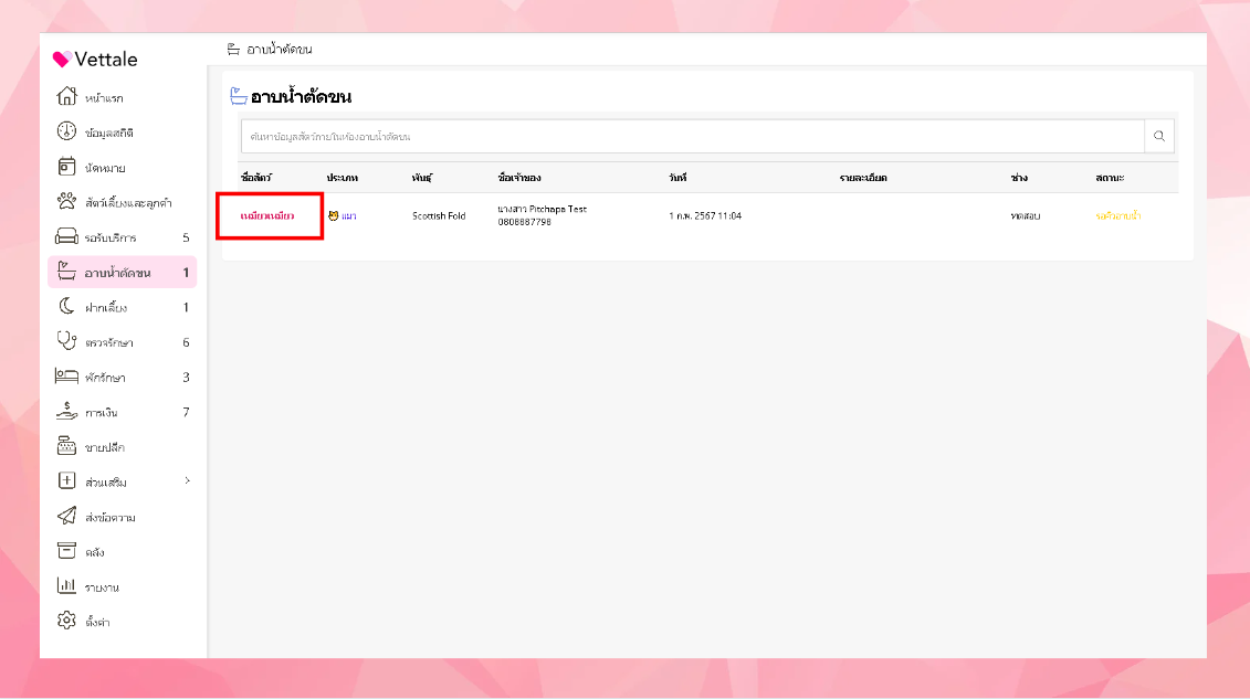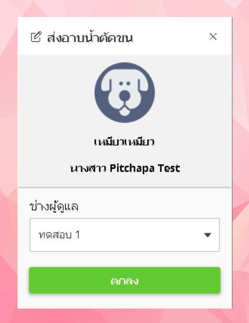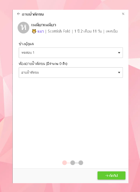 • ผู้ใช้งานเลือกสัตว์ที่ต้องการให้เข้าคิวรับอาบน้ำตัดขนได้ที่ชื่อสัตว์