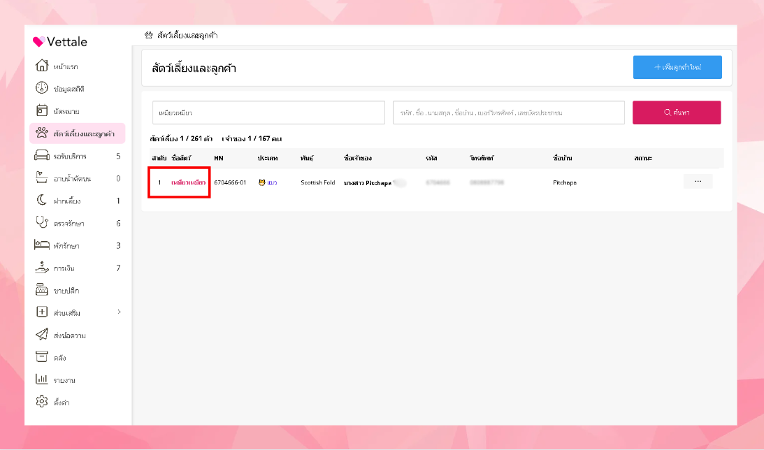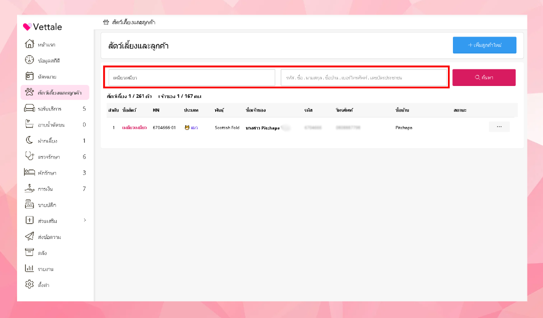 • ผู้ใช้งานกรอกข้อมูลสัตว์ หรือชื่อเจ้าของที่ต้องการได้ที่ช่องค้นหา และคลิกปุ่ม "ค้นหา"