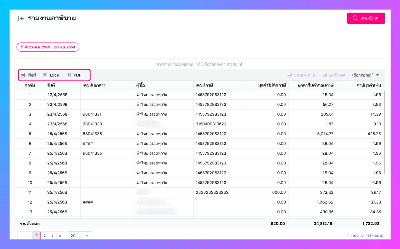 รายงานรวมข้อมูลของแต่ละรายการภาษีขายทั้งหมดในระยะเวลาที่กำหนด และแสดงรายละเอียดที่เป็นประโยชน์เกี่ยวกับแต่ละรายการ, ผู้ซื้อ, และมูลค่าที่ไม่คิดภาษี, มูลค่าสินค้าก่อนภาษี, ภาษีมูลค่าเพิ่ม