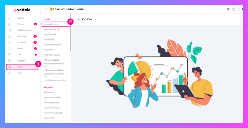 ไปที่เมนูรายงาน > คลิก สรุปรายได้ประจำวัน