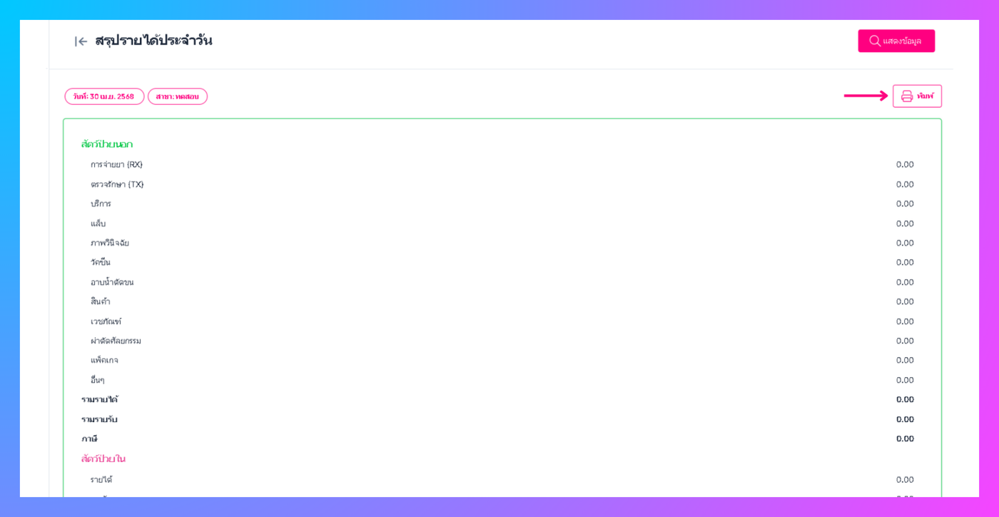 ระบบจะแสดงข้อมูลสรุปรายได้ประจำวัน (สามารถสั่งพิมพ์ได้)