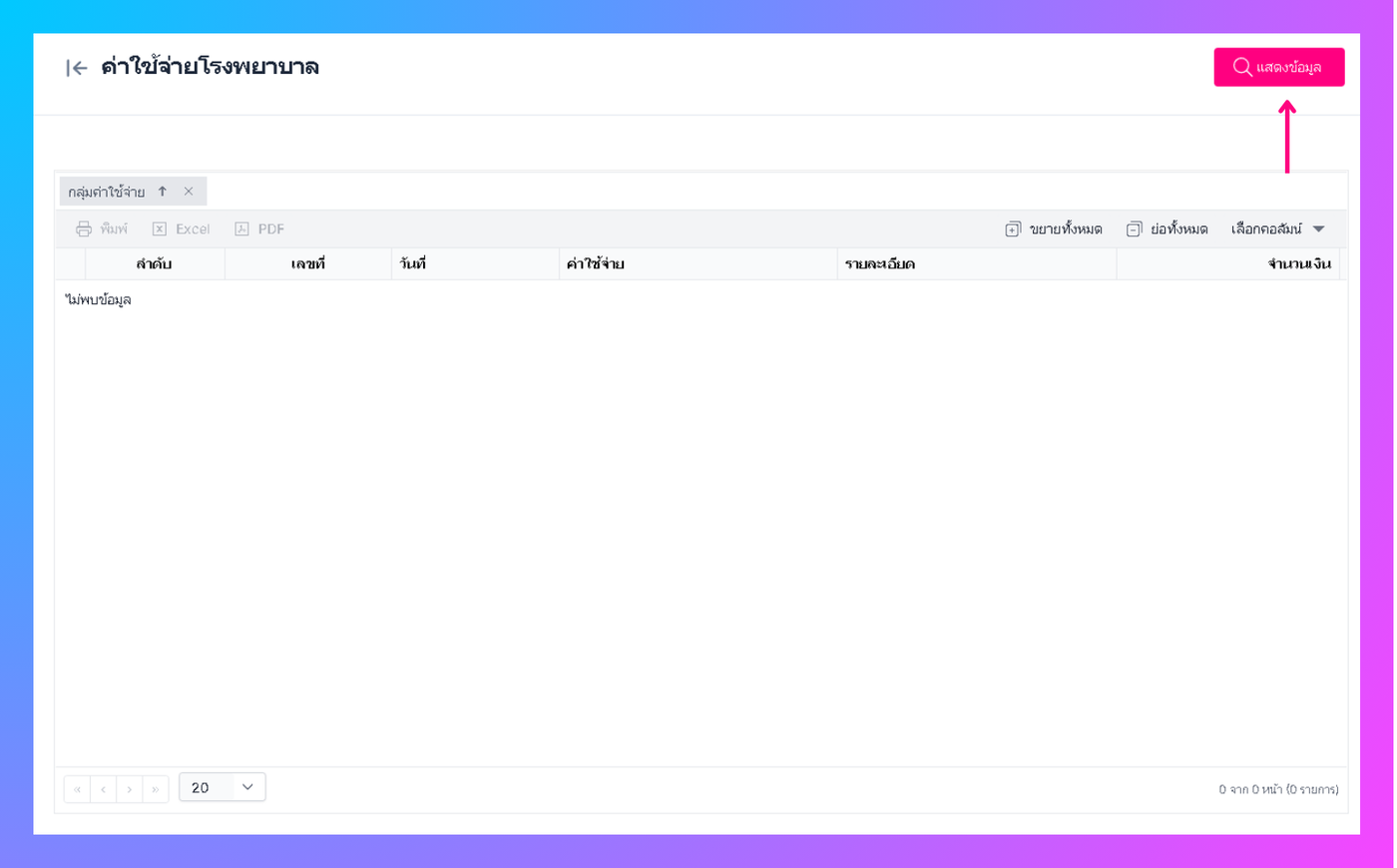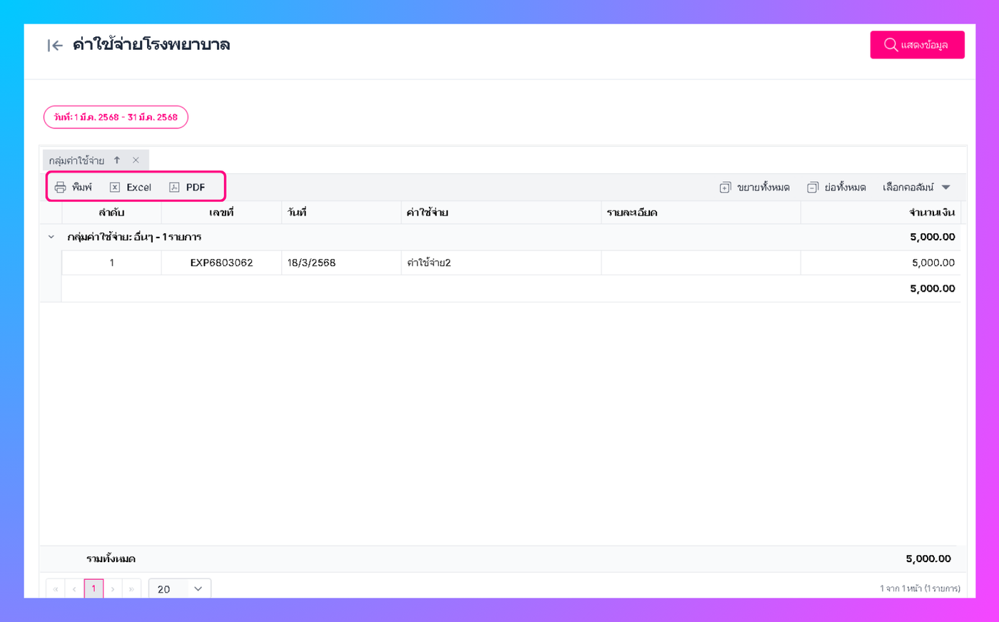 เมื่อผู้ใช้งานทำการคลิกตกลง ระบบจะแสดงข้อมูลที่ผู้ใช้งานทำการค้นหา (สามารถสั่งพิมพ์ และ เปิดใน excel ,PDF ได้)