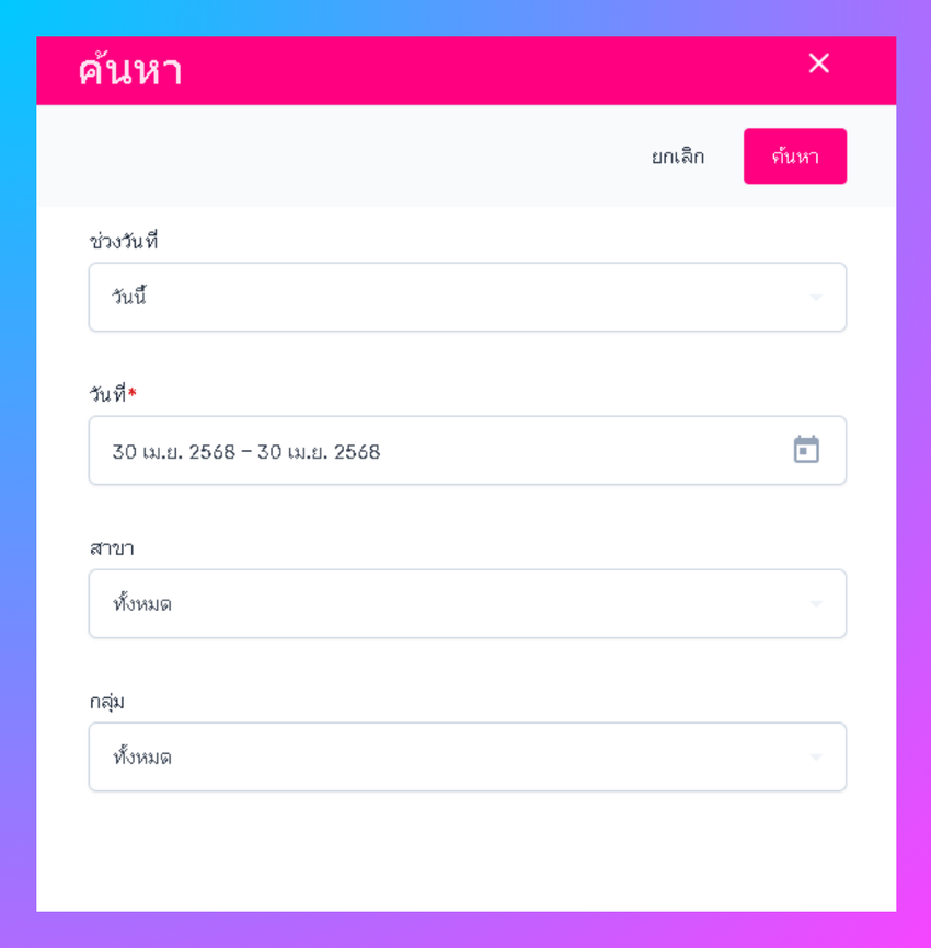 - ช่วงวันที่ ผู้ใช้งานเลือกช่วงวันที่ หรือ กำหนดวันที่เอง : ระบบจะทำการค้นหาในช่วงวันที่ที่ผู้ใช้งานระบุ