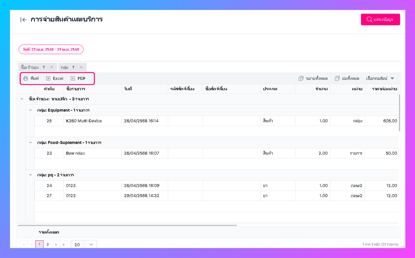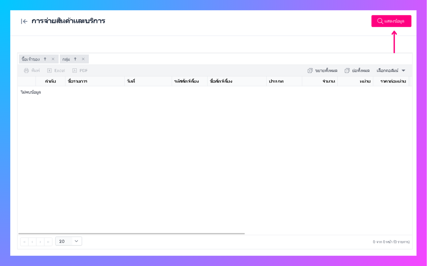เมื่อผู้ใช้งานทำการคลิกตกลง ระบบจะแสดงข้อมูลที่ผู้ใช้งานทำการค้นหา (สามารถสั่งพิมพ์ และ เปิดใน excel ,PDF ได้)