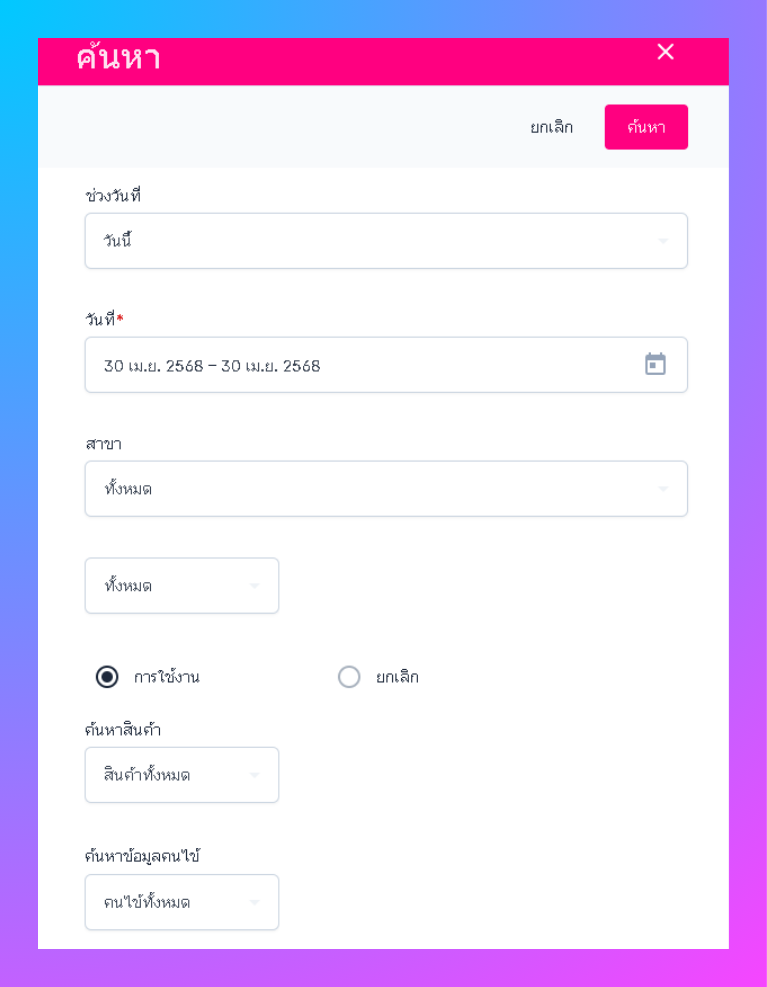 - ช่วงวันที่ ผู้ใช้งานเลือกช่วงวันที่ หรือ กำหนดวันที่เอง : ระบบจะทำการค้นหาในช่วงวันที่ที่ผู้ใช้งานระบุ