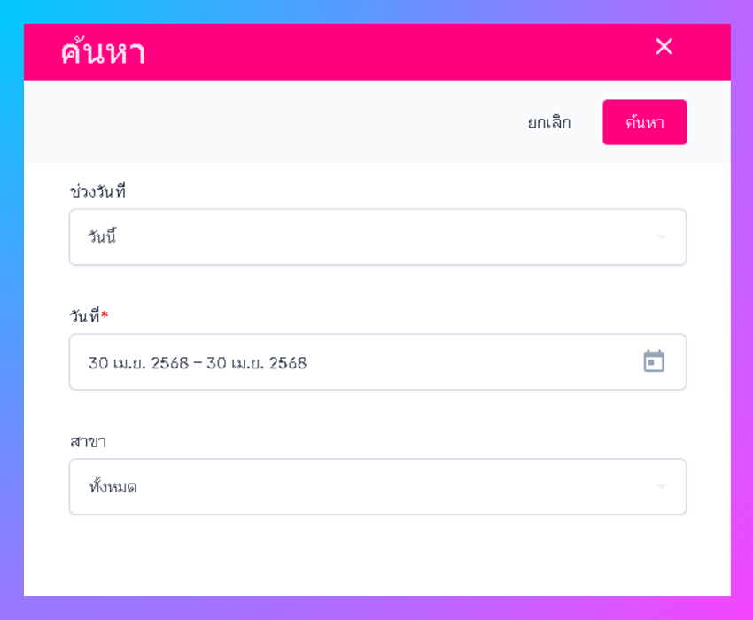 - ช่วงวันที่ ผู้ใช้งานเลือกช่วงวันที่ หรือ กำหนดวันที่เอง : ระบบจะทำการค้นหาในช่วงวันที่ที่ผู้ใช้งานระบุ