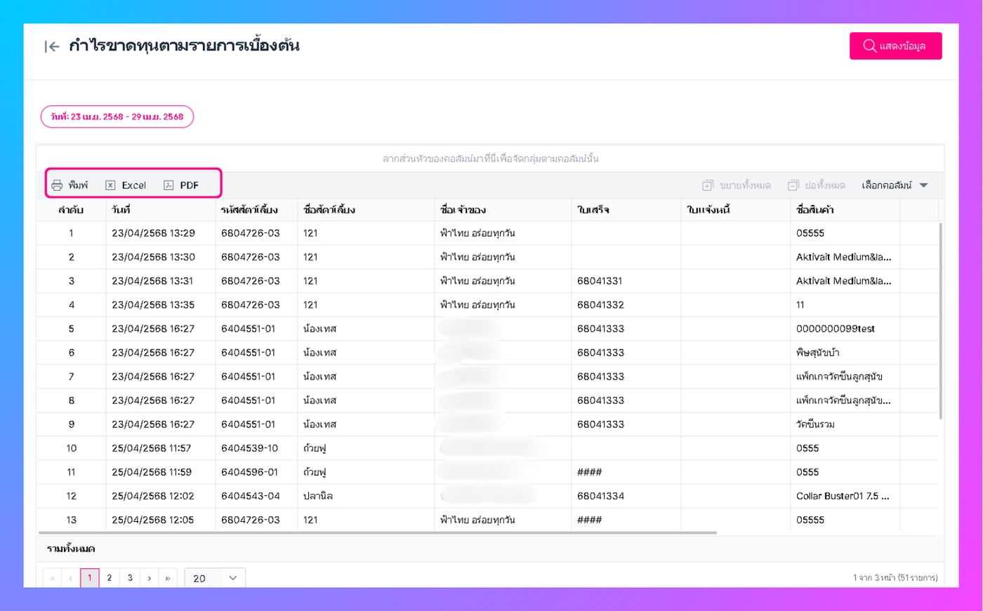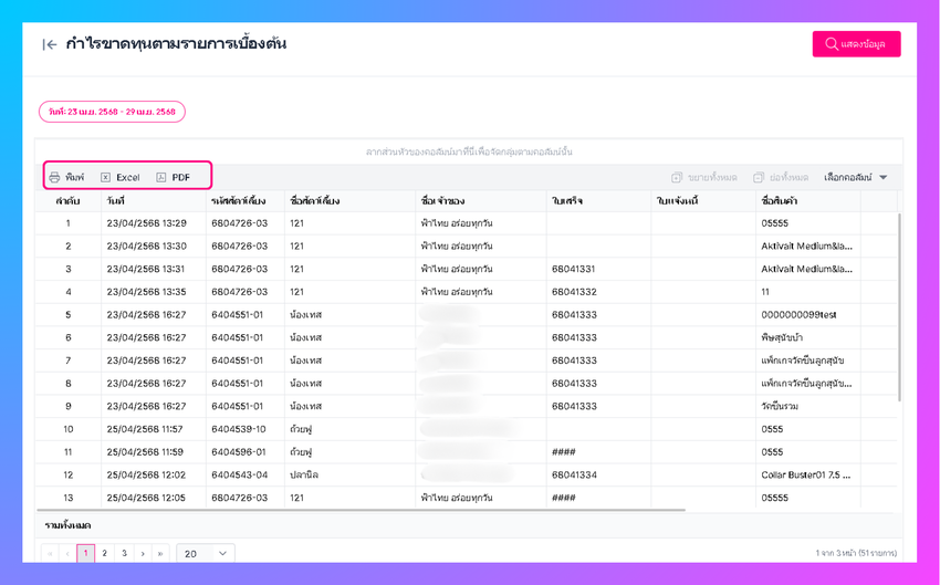 เมื่อผู้ใช้งานทำการคลิกตกลง ระบบจะแสดงข้อมูลที่ผู้ใช้งานทำการค้นหา (สามารถสั่งพิมพ์ และ เปิดใน excel ได้)