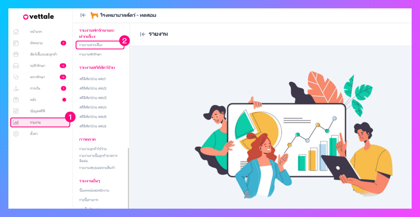 รายงานฝากเลี้ยง เป็นการรายงานข้อมูลการฝากเลี้ยงของสัตว์ป่วยแก่ผู้ใช้งานระบบและทำความเข้าใจถึงข้อมูลการฝากเลี้ยงของสัตว์ที่โรงพยาบาลในแต่ละวัน