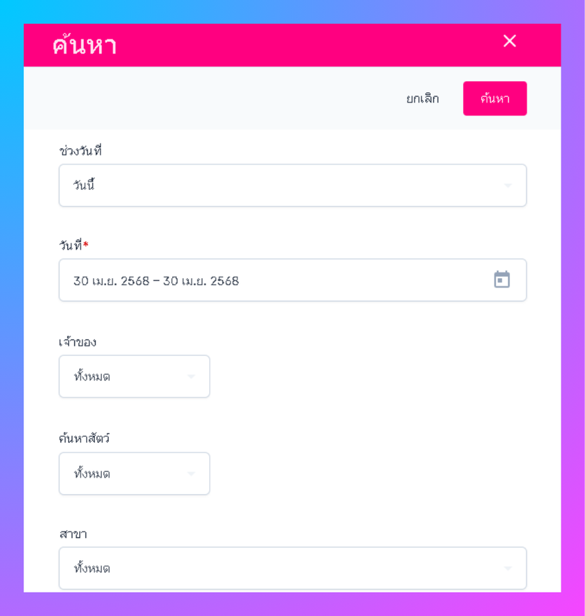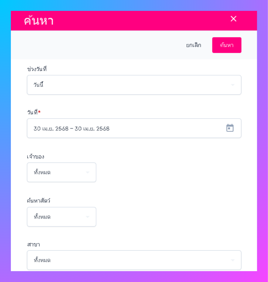 - ผู้ใช้งานสามารถเลือกข้อมูลสัตว์เลี้ยงทั้งหมด หรือ ระบุ เป็นรายตัวได้โดยการค้นหาจาก รหัส หรือ ชื่อสัตว์