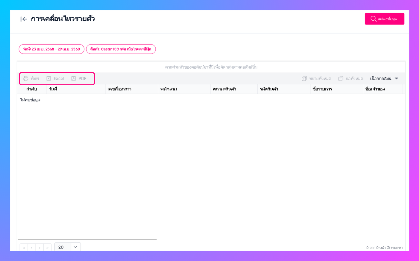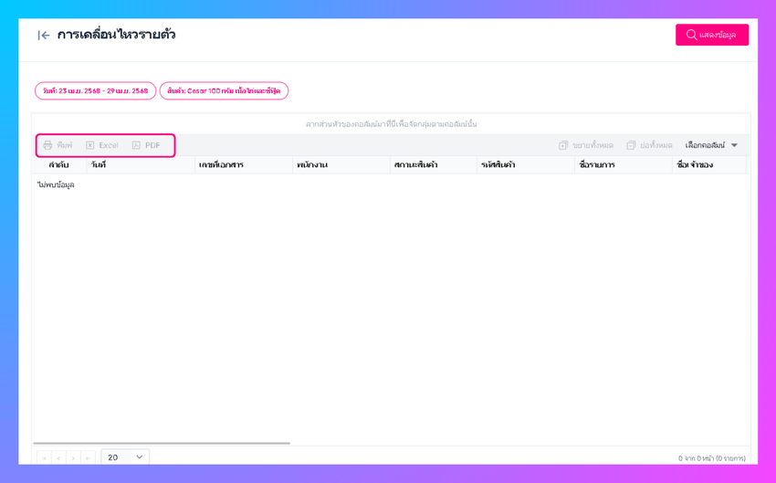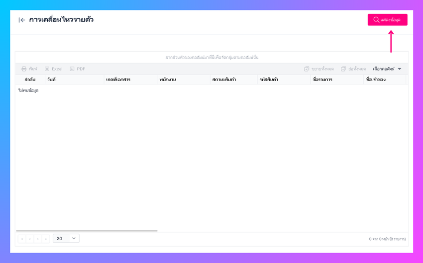 เมื่อผู้ใช้งานทำการคลิกตกลง ระบบจะแสดงข้อมูลที่ผู้ใช้งานทำการค้นหา (สามารถสั่งพิมพ์ และ เปิดใน excel ,PDF ได้)