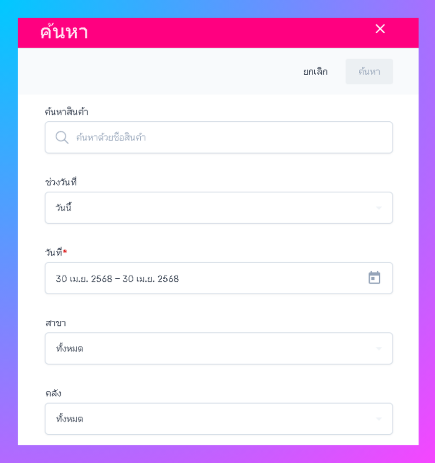 *ผู้ใช้งานสามารถทำการค้นหาสินค้าที่ยังใช้งานอยู่ หรือ ยกเลิก ได้จากคลังที่ผู้ใช้งานเลือก และในช่วงวันที่, คลัง ที่คุณกำหนด หลังจากที่ผู้ใช้งานให้ข้อมูลนี้ ระบบหรือโปรแกรมที่คุณใช้งานจะทำการค้นหาและแสดงผลลัพธ์ตามเงื่อนไขที่ผู้ใช้งานกำหนด