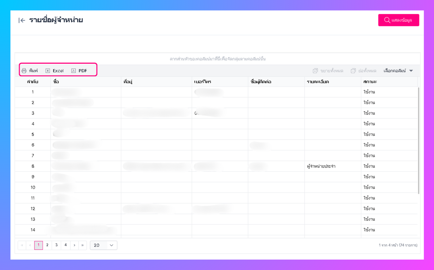 เมื่อผู้ใช้งานทำการคลิกตกลง ระบบจะแสดงข้อมูลที่ผู้ใช้งานทำการค้นหา (สามารถสั่งพิมพ์ และ เปิดใน excel ,PDFได้)