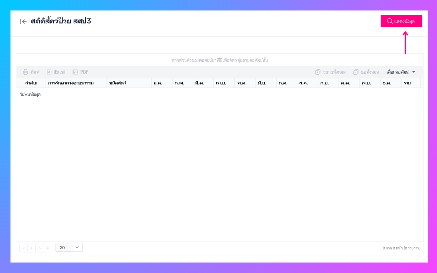 เมื่อผู้ใช้งานทำการคลิกตกลง ระบบจะแสดงข้อมูลที่ผู้ใช้งานทำการค้นหา (สามารถสั่งพิมพ์ และ เปิดใน excel ,PDFได้)
