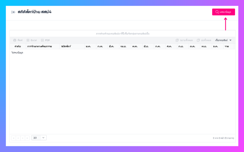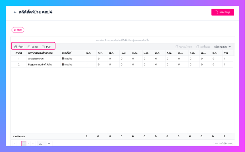 เมื่อผู้ใช้งานทำการคลิกตกลง ระบบจะแสดงข้อมูลที่ผู้ใช้งานทำการค้นหา (สามารถสั่งพิมพ์ และ เปิดใน excel ,PDFได้)
