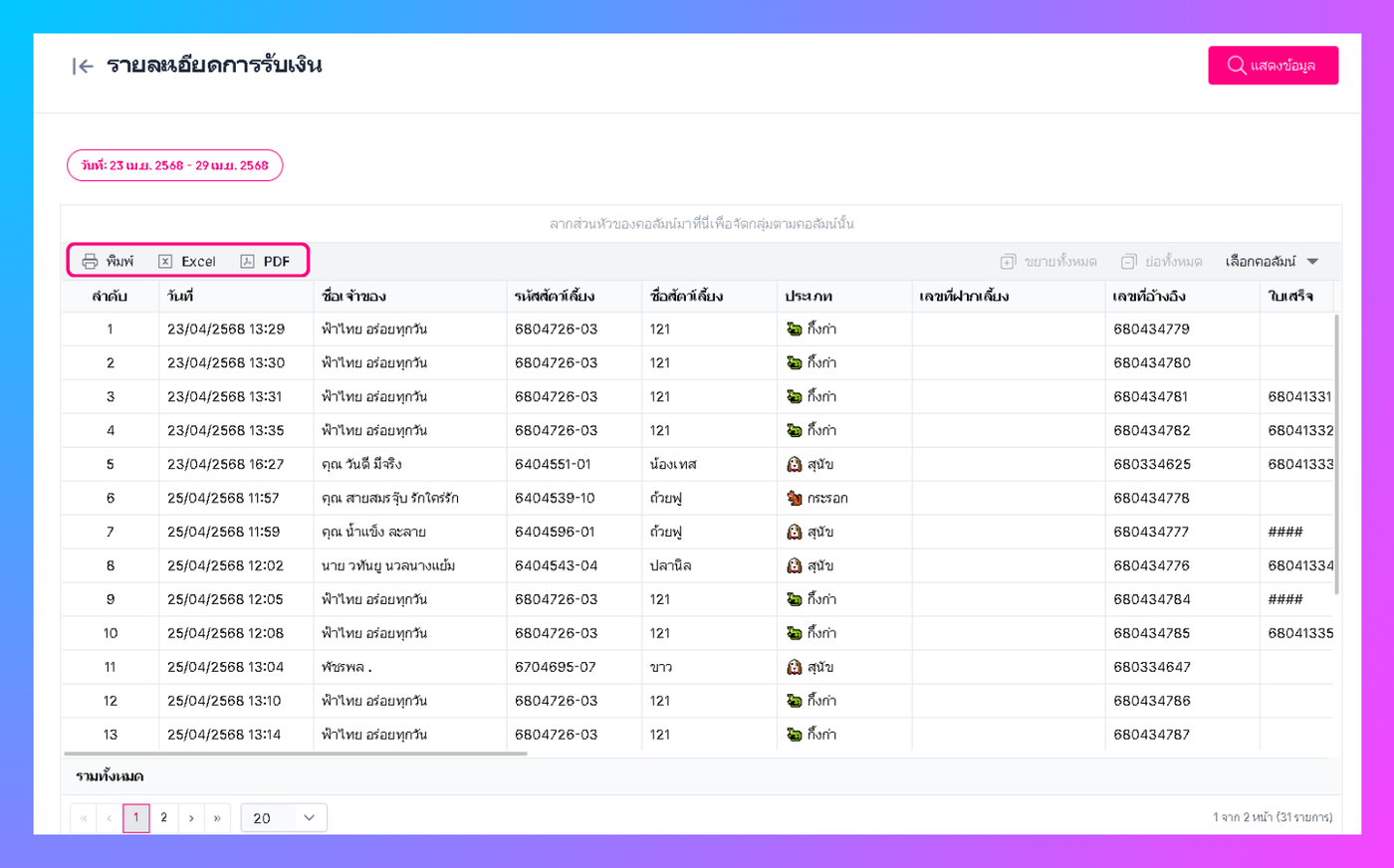 เมื่อผู้ใช้งานทำการคลิกตกลง ระบบจะแสดงข้อมูลที่ผู้ใช้งานทำการค้นหา (สามารถสั่งพิมพ์ และ เปิดใน excel ,PDF ได้)