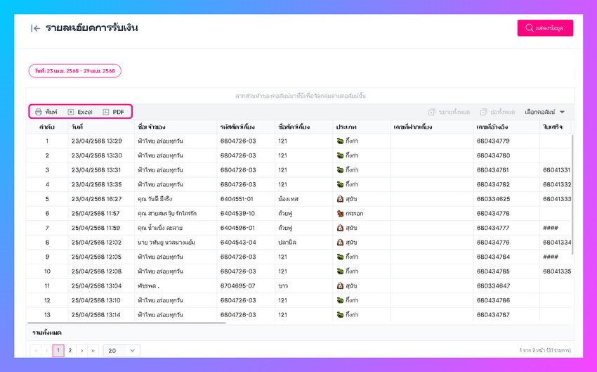 นี่คือระบบการค้นหารายละเอียดการรับเงินนั้นช่วยให้ผู้ใช้สามารถทำการค้นหาข้อมูลที่เกี่ยวข้องกับรับเงินของลูกค้าได้ โดยมีความสามารถในการกรองข้อมูลตามหลายเงื่อนไข ซึ่งทำให้การค้นหาข้อมูลเป็นไปอย่างมีประสิทธิภาพและรวดเร็ว