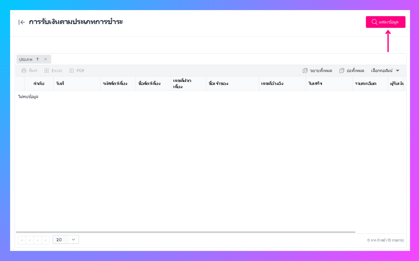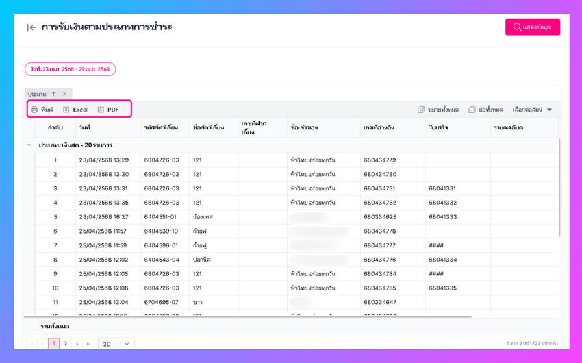 เมื่อผู้ใช้งานทำการคลิกตกลง ระบบจะแสดงข้อมูลที่ผู้ใช้งานทำการค้นหา (สามารถสั่งพิมพ์ และ เปิดใน excel ,PDF ได้)