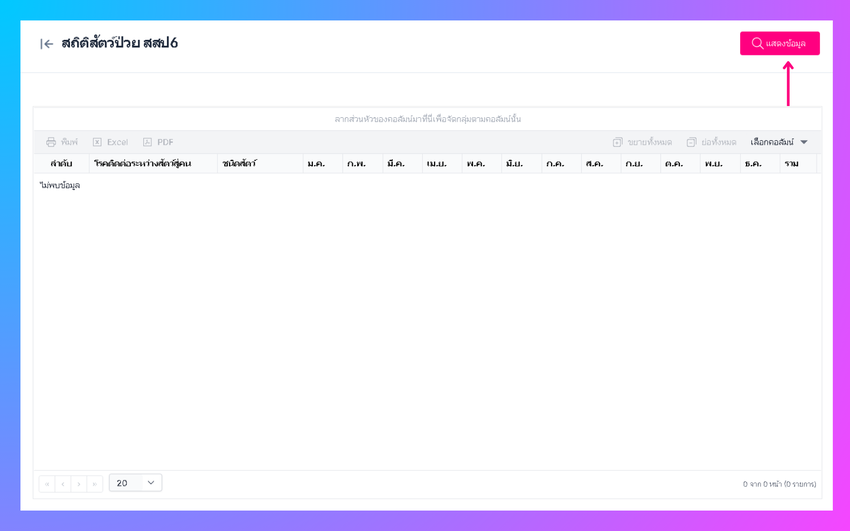 เมื่อผู้ใช้งานทำการคลิกตกลง ระบบจะแสดงข้อมูลที่ผู้ใช้งานทำการค้นหา (สามารถสั่งพิมพ์ และ เปิดใน excel ได้)