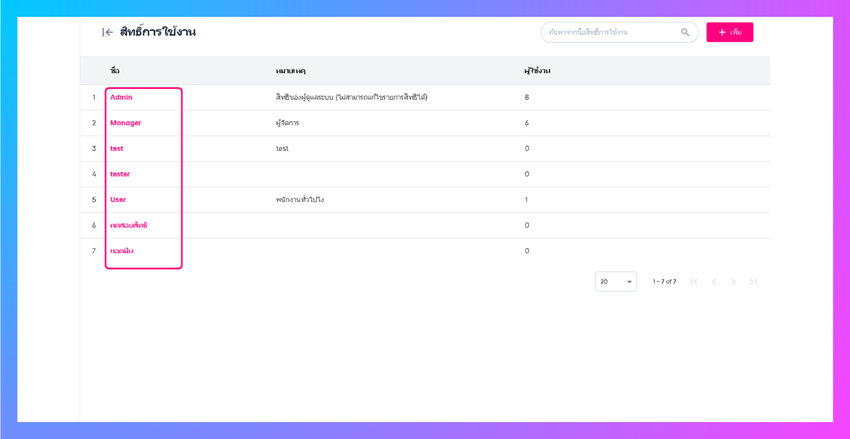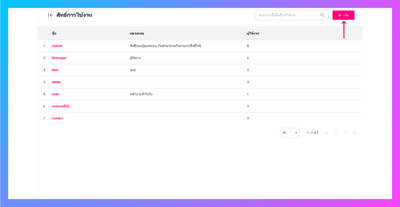 เมื่อเข้าสู่หน้าสิทธิ์ผู้ใช้งานคลิกปุ่ม "เพิ่ม"