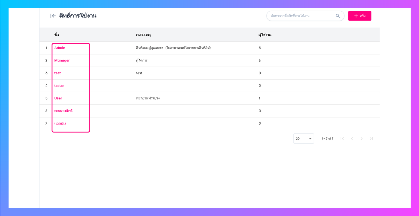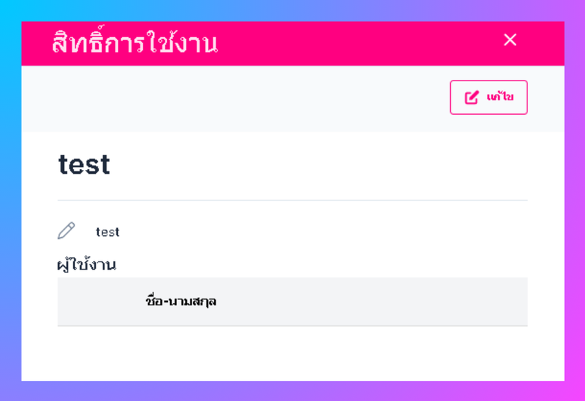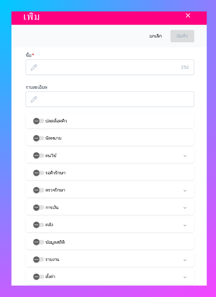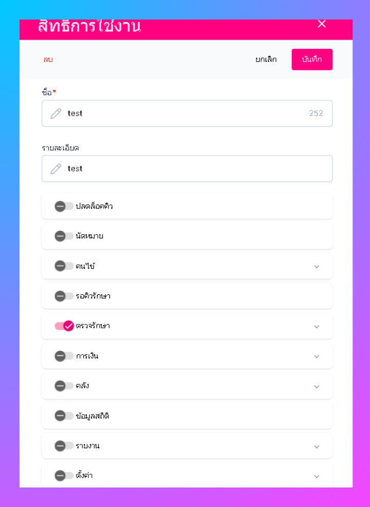 ผู้ใช้งานสามารถแก้ไขชื่อและรายละเอียดได้ และ เปิด-ปิดสิทธิ์ที่ต้องการให้เข้าถึงได้