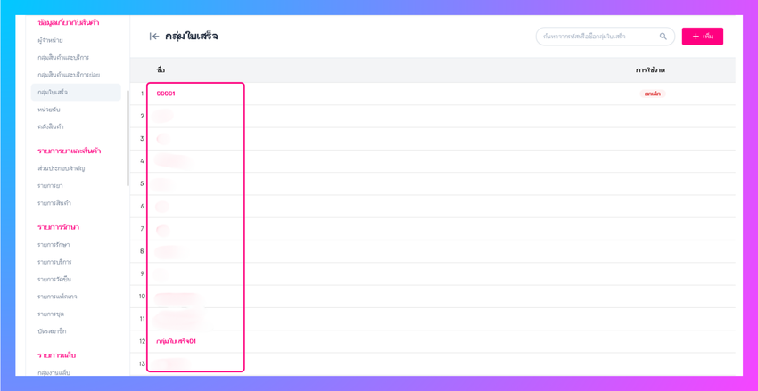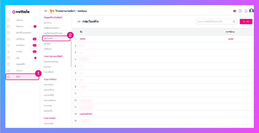 หากผู้ใช้งานต้องการตั้งค่ากลุ่มใบเสร็จ ทำได้โดยการไปที่เมนูตั้งค่า > ข้อมูลเกี่ยวกับสินค้า > กลุ่มใบเสร็จ