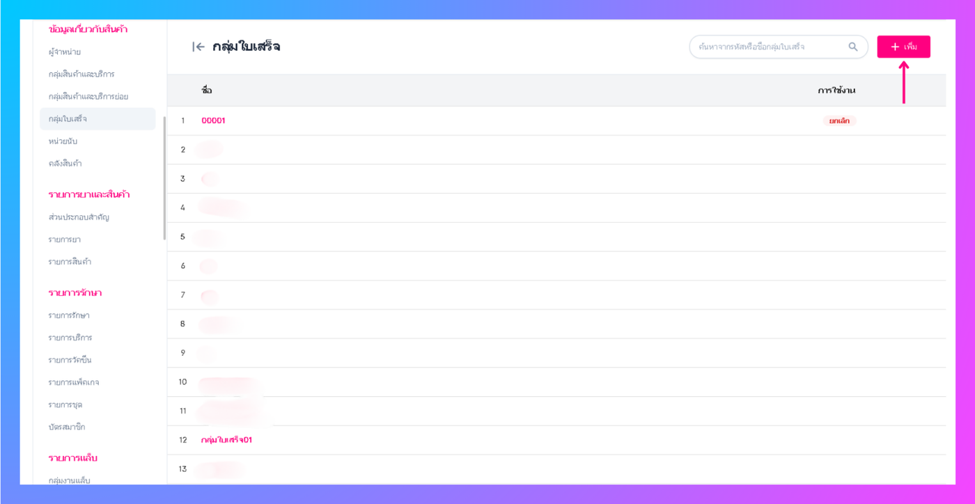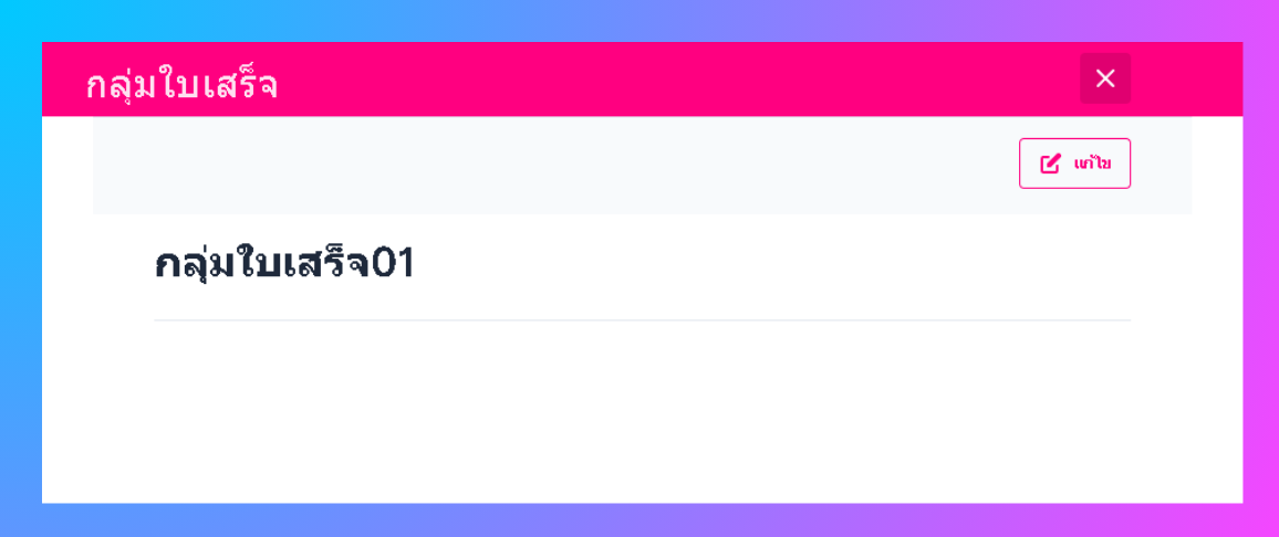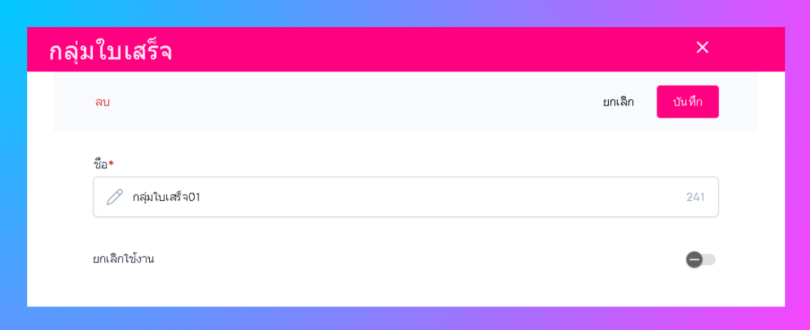 ระบบจะเข้าสู่หน้าแก้ไขกลุ่มใบเสร็จ ผู้ใช้งานสามารถแก้ไขชื่อ และ เลือกยกเลิกการใช้งานได้